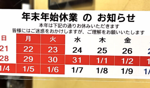 令和7年から令和8年にかけてのお休みは、以下のように休ませていただく事にいたしました。 年末は 28日(日)まで 通常通り営業しますが、少し長くお休みをいただき、年始は 1月7日(水)から 営業を再開させていただきます。…