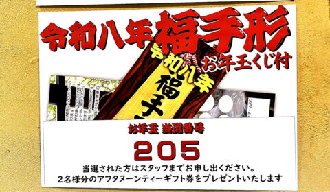 令和8年福手形のお年玉抽選を行いました。 今年の当選番号は、205 です。 205のスタンプを押された福手形をお持ちの方はスタッフまでお声がけください。2名様分のアフタヌーンティー ギフト券を差し上げます。