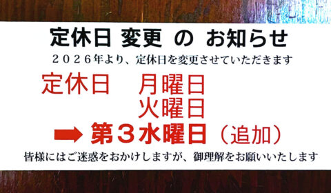 2026年1月より、月曜日、火曜日の定休日に加え、第3水曜日も定休日としてお休みさせていただく事といたしました。 定休日毎週、月曜日、火曜日第3週、水曜日 ( 追加) 店主も高齢となり、無理をせず、1年でも長く営業を続け…